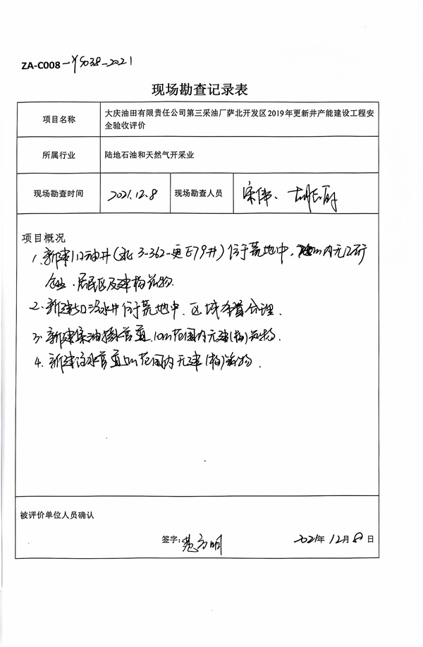 大慶油田有限責任公司第三采油廠薩北開發區2019年更新井產能建設工程安全驗收評價報告 |