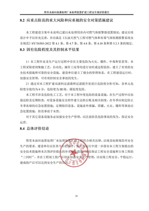 塔里木油田迪那處理廠水處理裝置擴建工程符合相關法律、法規及標準規范對安全生產的要求。建設單位應在其今后的設計、施工和運行中進一步落實本工程方案提出的安全技術措施和本次預評價提出的補充安全措施,確實保證工程安全設施和主體工程的“三同時”,并在工程竣工投產后切實加強安全生產管理,以實現工程安全、平穩運行,建成投產后可以達到安全生產的目的。 |