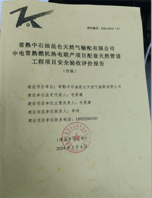 常熟中石油昆侖天然氣輸配有限公司中電常熟燃機熱電聯產項目配套天然管道工程項目安全設施竣工驗收評價報告