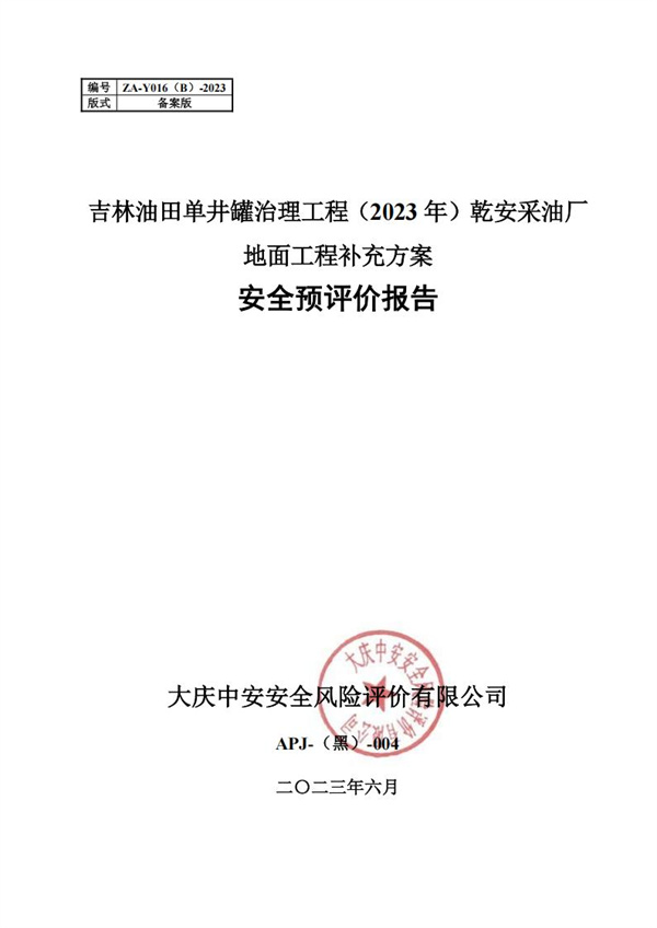 吉林油田單井罐治理工程(2023年)乾安采油廠地面工程補充方案 安全預評價 |