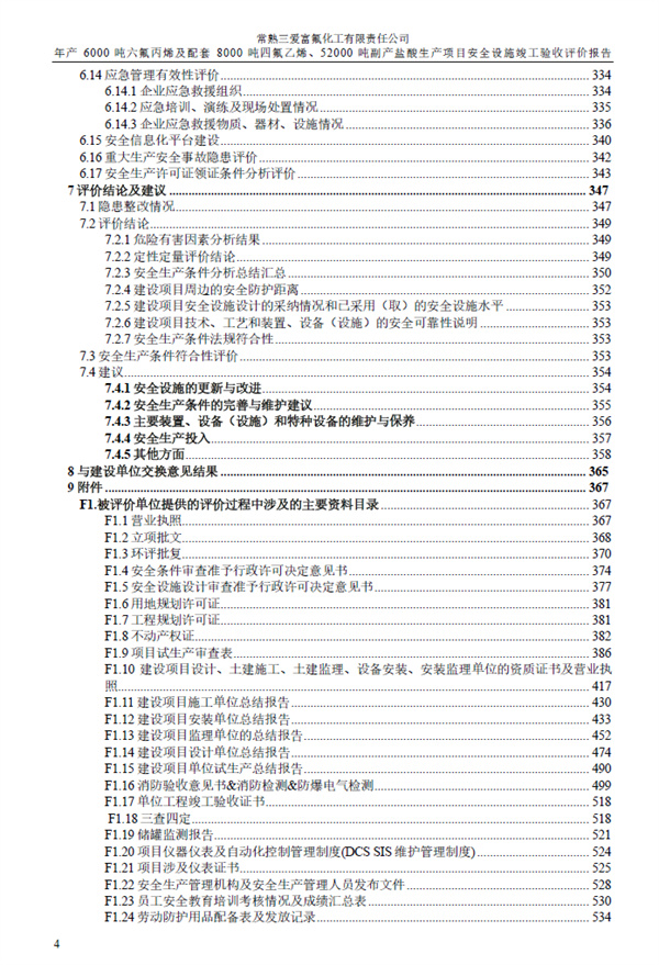 常熟三愛富氟化工有限責任公司年產6000噸六氟丙烯及配套8000噸四氟乙烯、52000噸副產鹽酸生產項目安全設施竣工驗收評價報告 |