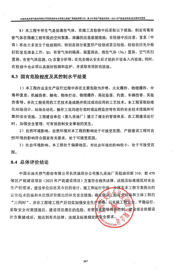 中國石油天然氣股份有限公司長慶油田分公司第九采油廠吳起油田新310、新479等區產能建設項目(2025年產能建設項目)方案符合相關法律、法規及標準規范對安全生產的要求。建設單位應在其今后的設計、施工和運行中進一步落實本工程方案提出的安全技術措施和本次預評價提出的補充安全措施,確實保證工程安全設施和主體工程的“三同時”,并在工程竣工投產后切實加強安全生產管理,以實現工程安全、平穩運行,采取安全對策措施后,建設項目潛在的危險、有害因素能夠得到控制。建設項目依據設計方案建成后,能達到有關法律、法規及標準規定的安全要求。 |
