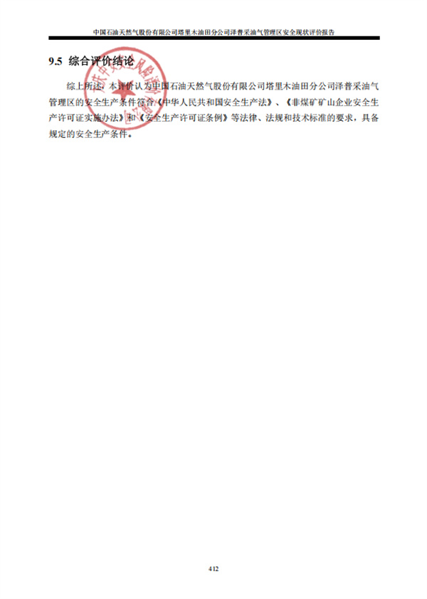 本評價認為中國石油天然氣股份有限公司塔里木油田分公司澤普采油氣管理區的安全生產條件符合《中華人民共和國安全生產法》、《非煤礦礦山企業安全生產許可證實施辦法》和《安全生產許可證條例》等法律、法規和技術標準的要求,具備規定的安全生產條件。 |