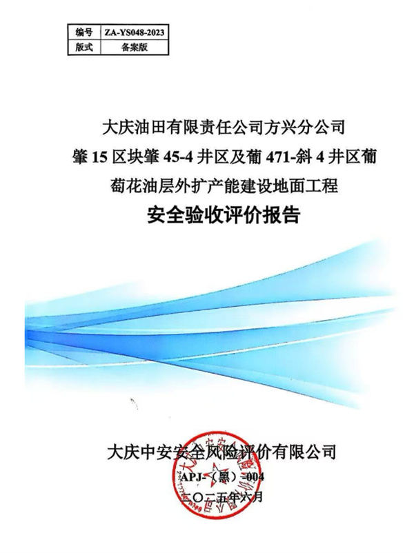 大慶油田有限責任公司方興分公司肇15區(qū)塊肇45-4井區(qū)及葡471-斜4井區(qū)葡萄花油層外擴產(chǎn)能建設(shè)地面工程安全驗收評價
