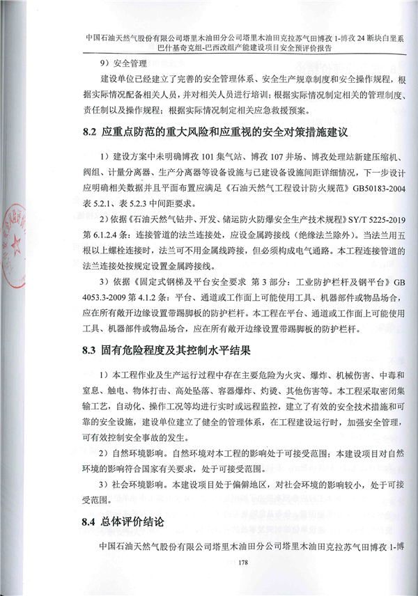 中國石油天然氣股份有限公司塔里木油田分公司塔里木油田克拉蘇氣田博孜1-博孜24斷塊白堊系巴什基奇克組-巴西改組產(chǎn)能建設項目建設方案符合相關(guān)法律、法規(guī)及標準規(guī)范對安全生產(chǎn)的要求。建設單位應在其今后的設計、施工和運行中進一步落實本工程方案提出的安全技術(shù)措施和本次預評價提出的補充安全措施,切實保證工程安全設施和主體工程的“三同時”,并在工程竣工投產(chǎn)后切實加強安全生產(chǎn)管理,以實現(xiàn)工程安全、平穩(wěn)運行,本項目危險有害因素能夠得到控制,建成投產(chǎn)后,能達到有關(guān)法律、法規(guī)及標準規(guī)定的安全要求。 |
