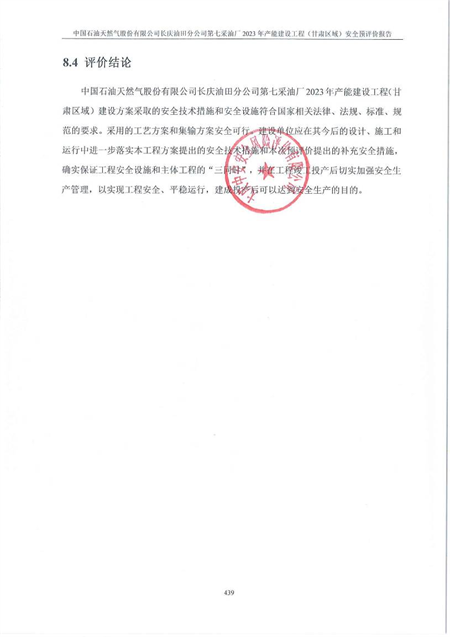 中國石油天然氣股份有限公司長慶油田分公司第七采油廠2023年產能建設工程(甘肅區域)建設方案采取的安全技術措施和安全設施符合國家相關法律、法規、標準、規范的要求。采用的工藝方案和集輸方案安全可行。建設單位應在其今后的設計、施工和運行中進一步落實本工程方案提出的安全技術措施和本次預評價提出的補充安全措施,確實保證工程安全設施和主體工程的“三同時”,并在工程竣工投產后切實加強安全生產管理,以實現工程安全、平穩運行,建成投產后可以達到安全生產的目的。 |