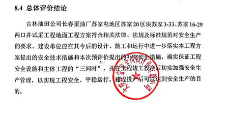 吉林油田公司長春采油廠蘇家屯地區(qū)蘇家20區(qū)塊蘇家3-33、蘇家16-29兩口井試采工程地面工程方案符合相關(guān)法律、法規(guī)及標(biāo)準(zhǔn)規(guī)范對安全生產(chǎn)的要求。建設(shè)單位應(yīng)在其今后的設(shè)計、施工和運行中進一步落實本工程方案提出的安全技術(shù)措施和本次預(yù)評價提出的補充安全措施,確實保證工程安全設(shè)施和主體工程的“三同時”,并在工程竣工投產(chǎn)后切實加強安全生產(chǎn)管理,以實現(xiàn)工程安全、平穩(wěn)運行,建成投產(chǎn)后可以達到安全生產(chǎn)的目的。 |
