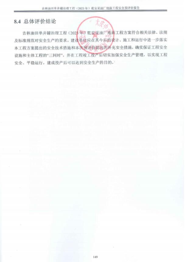 吉林油田單井罐治理工程(2023年)乾安采油廠地面工程方案符合相關法律、法規及標準規范對安全生產的要求。建設單位應在其今后的設計、施工和運行中進一步落實本工程方案提出的安全技術措施和本次預評價提出的補充安全措施,確實保證工程安全設施和主體工程的“三同時”,并在工程竣工投產后切實加強安全生產管理,以實現工程安全、平穩運行,建成投產后可以達到安全生產的目的。 |