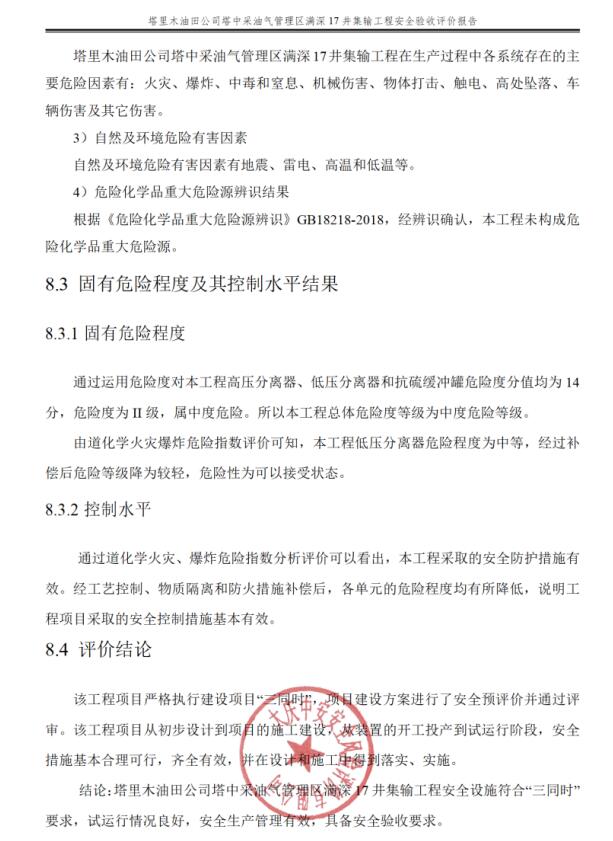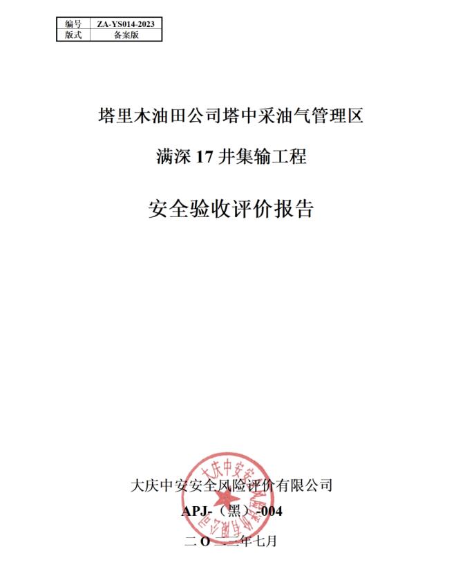 塔里木油田公司塔中采油氣管理區(qū)滿深17井集輸工程安全驗收評價