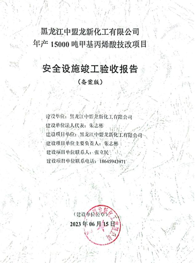 黑龍江中盟龍新化工有限公司年產15000噸甲基丙烯酸技改項目安全驗收評價報告
