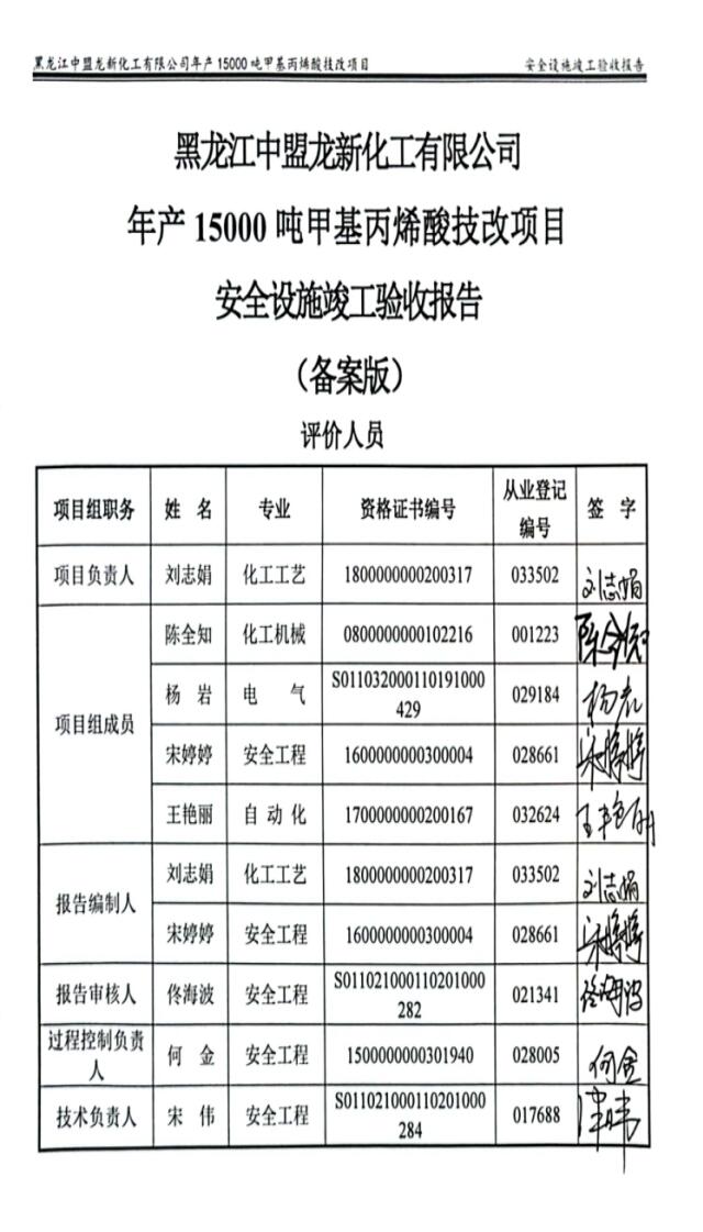 黑龍江中盟龍新化工有限公司年產15000噸甲基丙烯酸技改項目安全設施符合安全生產要求,具備安全驗收的條件。 |