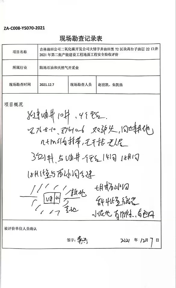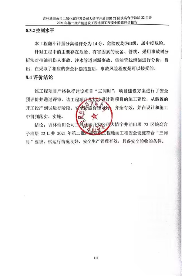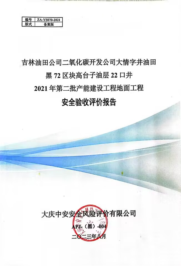 對(duì)吉林油田公司二氧化碳開(kāi)發(fā)公司大情字井油田黑72區(qū)塊高臺(tái)子油層22口井2021年第二批產(chǎn)能建設(shè)工程地面工程安全驗(yàn)收評(píng)價(jià)