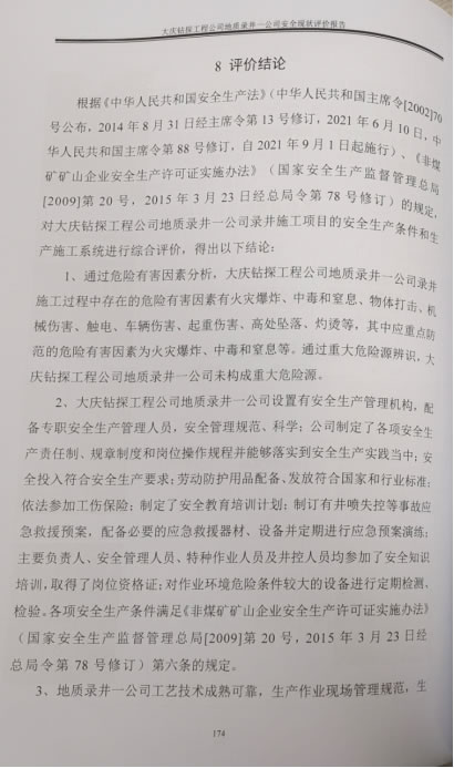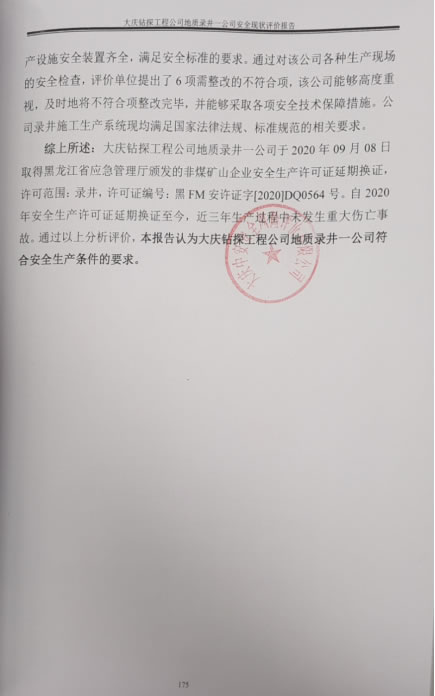 大慶鉆探工程公司地質(zhì)錄井一公司于2020年09月08日取得黑龍江省應急管理廳頒發(fā)的非煤礦山企業(yè)安全生產(chǎn)許可證延期換證,許可范圍:錄井,許可證編號:黑FM安許證字[2020]DQ0564號。自2020年安全生產(chǎn)許可證延期換證至今,近三年生產(chǎn)過程中未發(fā)生重大傷亡事故。通過以上分析評價,本報告認為大慶鉆探工程公司地質(zhì)錄井一公司符合安全生產(chǎn)條件的要求。 |