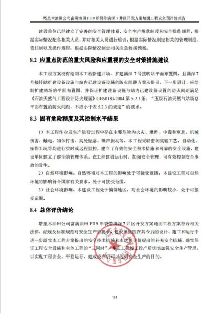 塔里木油田公司富滿油田FI19斷裂帶滿深7井區開發方案地面工程方案符合相關法律、法規及標準規范對安全生產的要求。建設單位應在其今后的設計、施工和運行中進一步落實本工程方案提出的安全技術措施和本次預評價提出的補充安全措施,確實保證工程安全設施和主體工程的“三同時”,并在工程竣工投產后切實加強安全生產管理,以實現工程安全、平穩運行,建成投產后可以達到安全生產的目的。 |