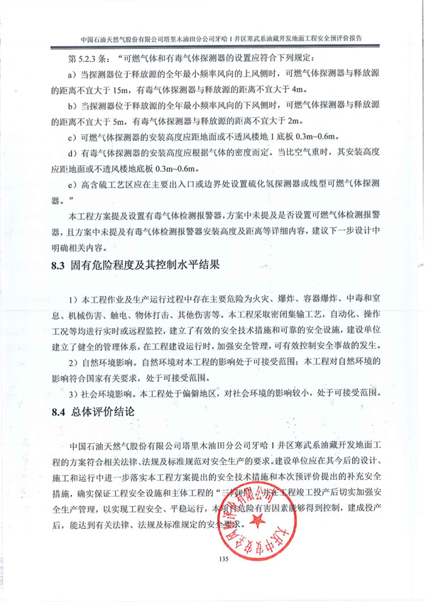 中國石油天然氣股份有限公司塔里木油田分公司牙哈1井區(qū)寒武系油藏開發(fā)地面工程的方案符合相關法律、法規(guī)及標準規(guī)范對安全生產(chǎn)的要求。建設單位應在其今后的設計、施工和運行中進一步落實本工程方案提出的安全技術措施和本次預評價提出的補充安全措施,確實保證工程安全設施和主體工程的“三同時”,并在工程竣工投產(chǎn)后切實加強安全生產(chǎn)管理,以實現(xiàn)工程安全、平穩(wěn)運行,本項目危險有害因素能夠得到控制,建成投產(chǎn)后,能達到有關法律、法規(guī)及標準規(guī)定的安全要求。 |