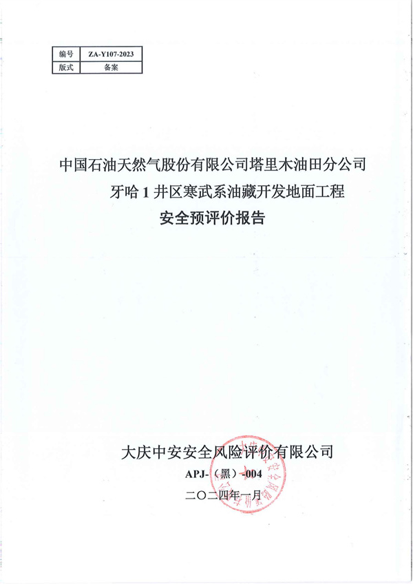 中國石油天然氣股份有限公司塔里木油田分公司牙哈1井區(qū)寒武系油藏開發(fā)地面工程安全預評價報告