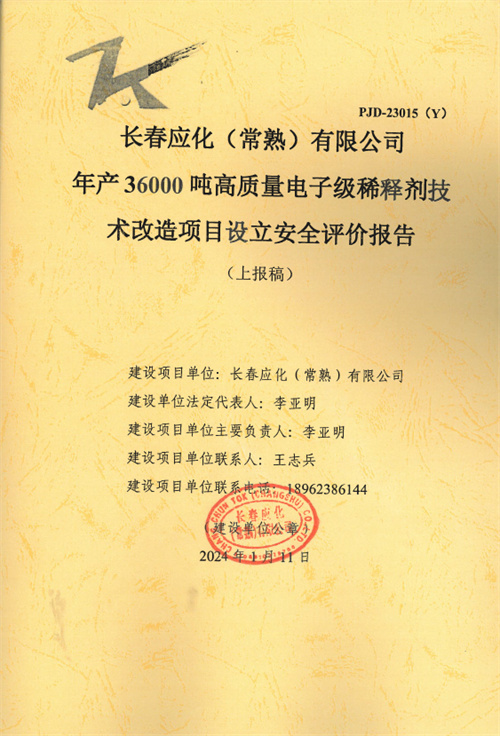 長(zhǎng)春應(yīng)化(常熟)有限公司年產(chǎn)36000噸高質(zhì)量電子級(jí)稀釋劑技術(shù)改造項(xiàng)目設(shè)立安全評(píng)價(jià)報(bào)告 |
