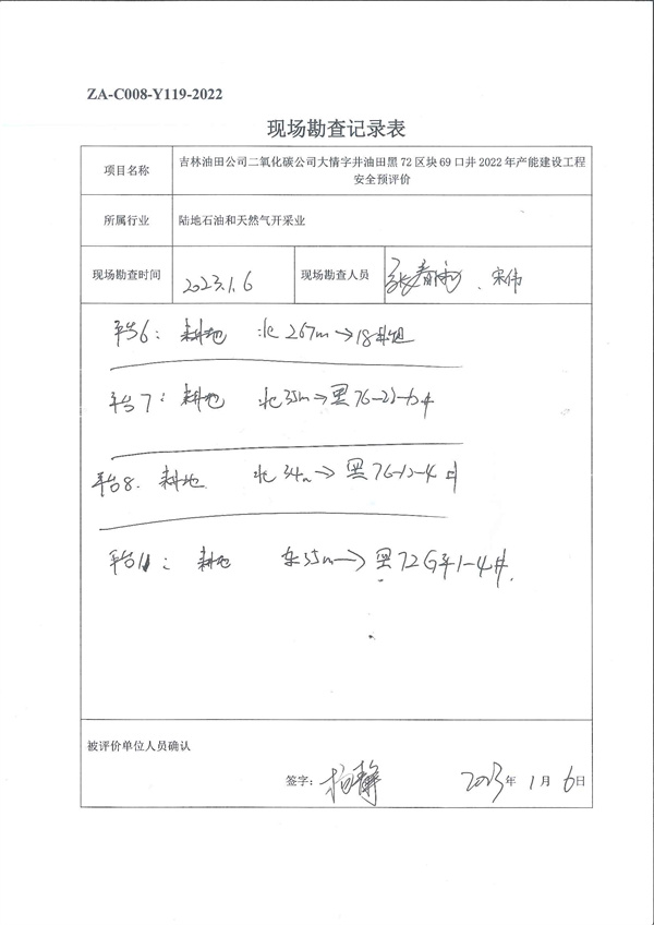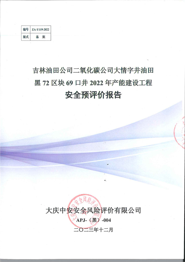 吉林油田二氧化碳開發公司大情字井油田黑72區塊69口井2022年產能建設工程安全預評價報告 |