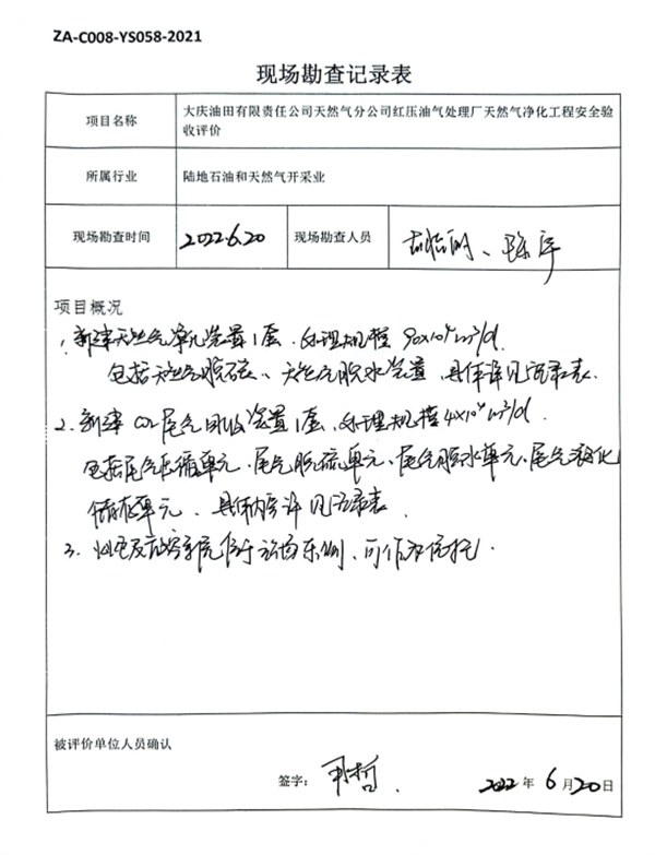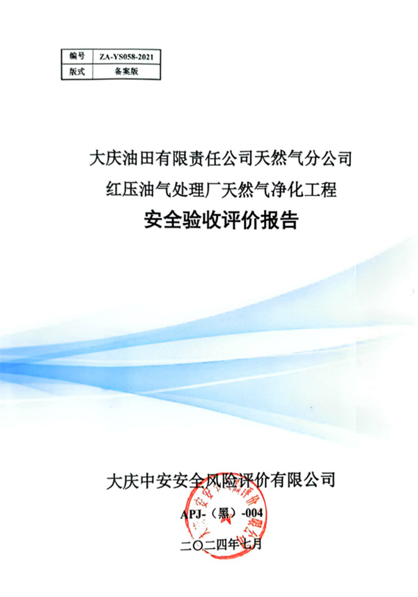大慶油田有限責(zé)任公司天然氣分公司紅壓油氣處理廠天然氣凈化工程安全驗(yàn)收評(píng)價(jià)報(bào)告