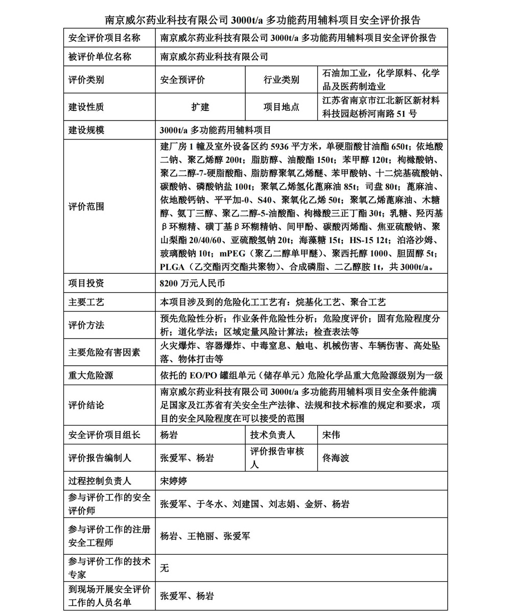南京威爾藥業科技有限公司3000t/a多功能藥用輔料項目安全評價報告