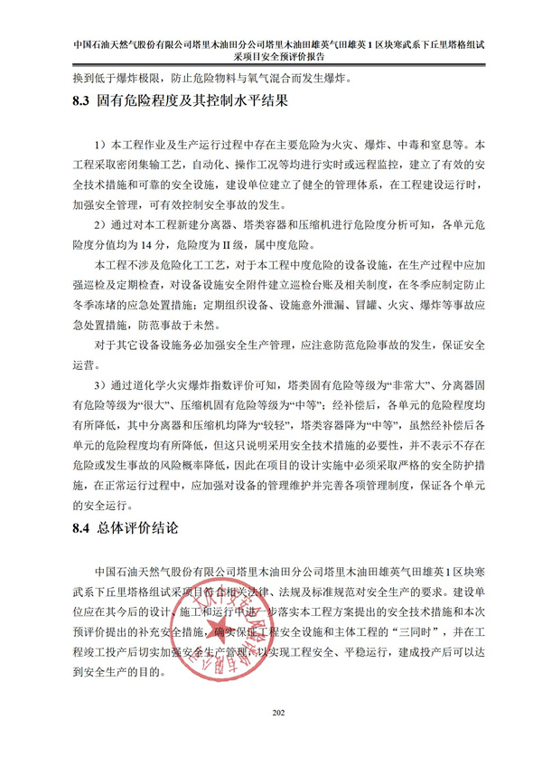 中國石油天然氣股份有限公司塔里木油田分公司塔里木油田雄英氣田雄英1區塊寒武系下丘里塔格組試采項目符合相關法律、法規及標準規范對安全生產的要求。建設單位應在其今后的設計、施工和運行中進一步落實本工程方案提出的安全技術措施和本次預評價提出的補充安全措施,確實保證工程安全設施和主體工程的“三同時”,并在工程竣工投產后切實加強安全生產管理,以實現工程安全、平穩運行,建成投產后可以達到安全生產的目的。 |