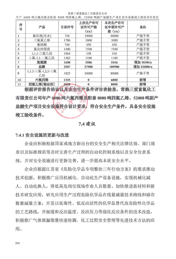 常熟三愛富氟化工有限責任公司年產6000噸六氟丙烯及配套8000噸四氟乙烯、52000噸副產鹽酸生產項目安全設施竣工驗收評價報告 |